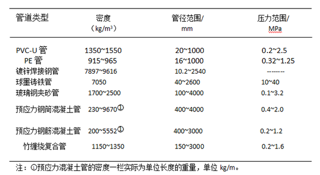 PVC-U管和PE管的管徑一般小于630 mm,常用于短距離輸水和田間灌溉管道。普通焊接鋼管和球墨鑄鐵管的最大管徑比普通塑料管稍大,其承壓能力高,一般用于閘閥連接、首部工程和泵站的進水和出水管道以及明鋪的灌溉輸水工程。玻璃鋼夾砂管、預應力混凝土管、竹纏繞復合管的管徑大于等于315mm(其中預應力鋼筒混凝土管、預應力鋼筋混凝土管的管徑最小為400 mm),最大管徑可以達到3 000至4 000 mm,最大承壓能力在2.0MPa左右,因此主要用于長距離輸水較大口徑的管道工程(見下表)。