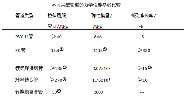 從拉伸強度和彈性模量上講,PVC-U管和PE管的彈性模量基本相當,竹纏繞復合管是塑料管道的2~3倍45 ,PE管的拉伸屈服應力比二者都小。鍍鋅焊接鋼管和球墨鑄鐵管強度最高,其拉伸屈服強度在185 MPa以上,鋼管的彈性模量和球墨鑄鐵管相當,在17 GPa以上,是塑料管道和竹纏繞復合管的67~244倍。